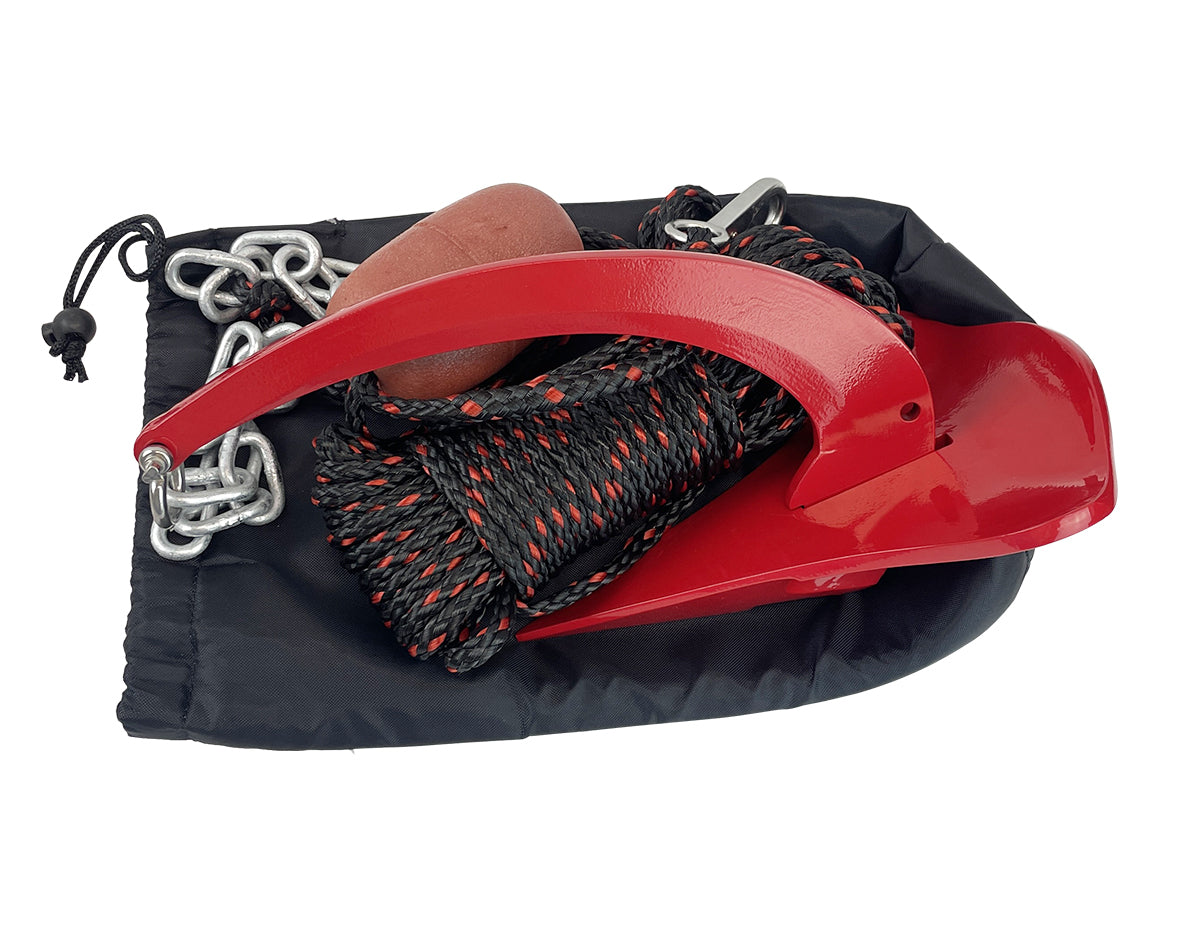 This complete kit includes anchor, float, rope, chain and bow shackle, all packed neatly within a small storage bag.