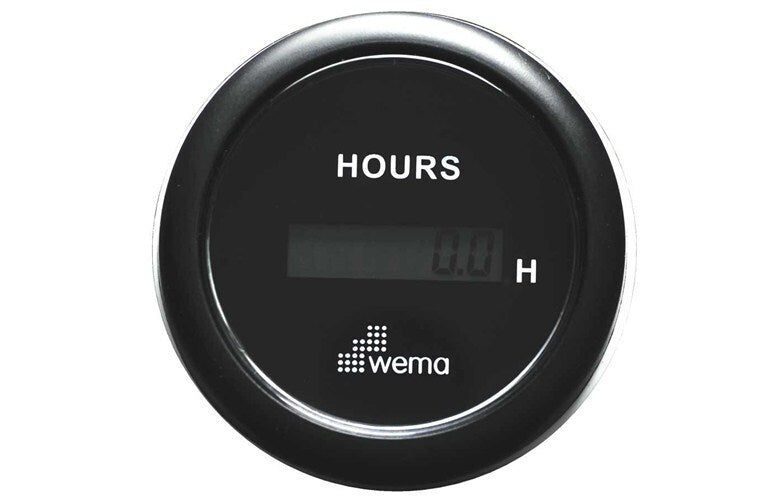 Digital hourmeter gauge with black dial and plastic bezel. Maximum count: 99999.9 hours before returning to 0.