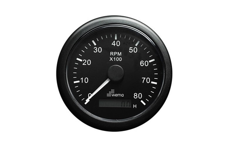 Wema tachometers combine an analogue style RPM scale with a digital hour counter display.