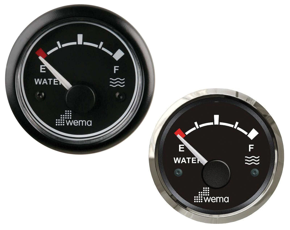 Water level gauge with black dial face and either a black plastic bezel or stainless steel bezel.