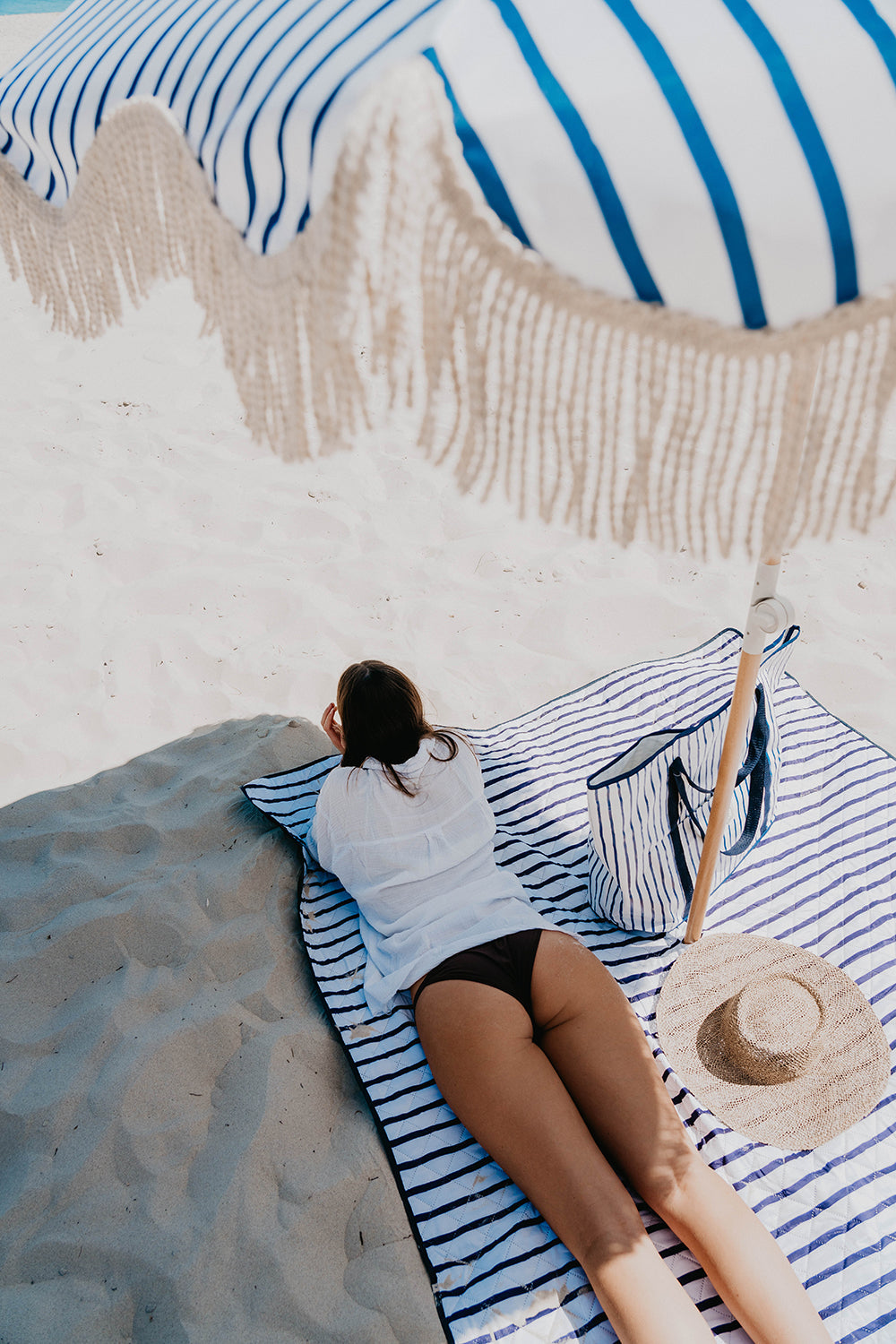 Introducing our Premium Umbrella, an Australian designed masterpiece. With its 1.75meter diameter, it provides ample shade for sunny days. Made from 100% canvas, it boasts a beautiful blue & white stripe with cotton fringing. The tilting mechanism ensures optimal sun protection, while the lotus wood pole adds a touch of elegance. It comes with a matching carry bag for easy transportation.