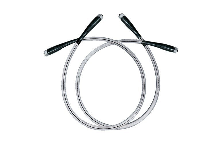 Two high pressure Kevlar standard flexible hoses with pre-crimped fittings and bend restrictors on both ends.