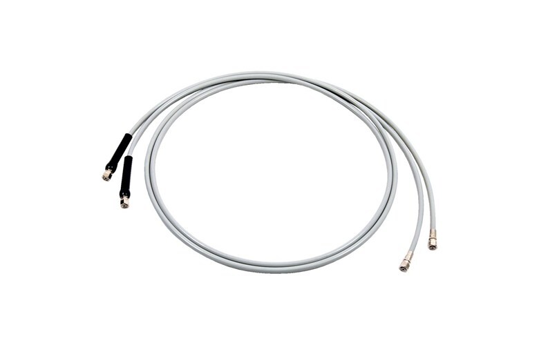 Two high pressure Kevlar stranded flexible hoses with pre-crimped fittings and bend restrictors on both ends.