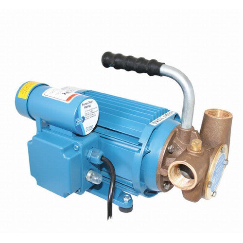 The Jabsco 53040-2003 is a bronze Flexible Impeller pump with a Nitrile Impeller, Nitrile/Carbon/Ceramic Mechanical seal, 1 Inch BSP internal threaded Ports, coupled to a 1450 RPM, 230 Volts, 50HZ Motor, with a 6 foot Cord. These pumps can be used where Bronze, self-priming, 9.2 GPM (35 LPM), High Pressure up to 30 PSI, debris-tolerance, and portable 230V AC 50Hz operation is desired. These flexible impeller pumps are self-priming and pump instantly with dry suction, lifts up to 10 feet (3m) and up to 22 feet (6.7m) when wetted. Permits cleaner, safer installations. No foot valve required. Be sure suction lines are airtight or pump will not self-prime. This Pump has an integral fluid reservoir to protect pump against dry running for up to 30 minutes. The motor is 4 Pole, single phase, 250 Watt, AC, Enclosure IP55. Fitted with manual reset thermal overload. Jabsco bronze bodied AC motor pumps are self-priming, portable and versatile, making them ideal for a wide range of applications wherever AC power is available. The Temperature limits for the Nitrile impeller in this pump : 45 degrees F to 180 degrees F (7 degrees C to 82 degrees C). The Nitrile impeller in this pump is good for oil-based products. This pump is rated to 40 minutes continuous duty at 1.5 bar differentential pressure with water at 20 degrees C ambient temperature.