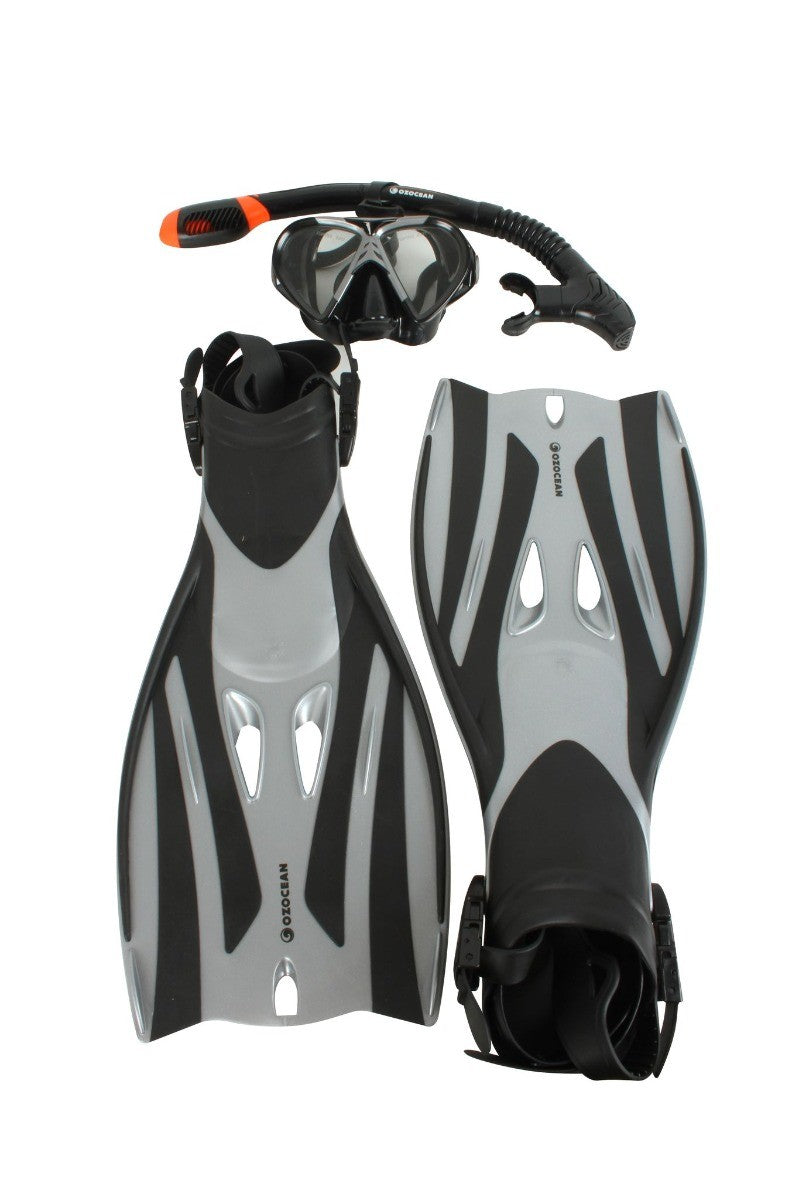 The Rotto Adults Mask, Fin and Snorkel set is available in Black and Grey. It has adjustable buckles and straps on both the mask and fins to ensure a comfortable fitting