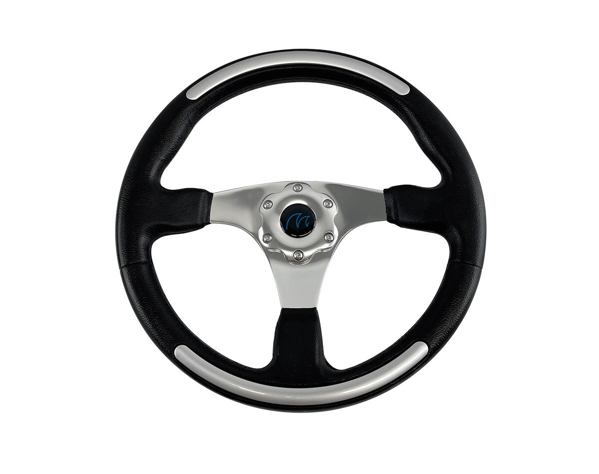 Aluminium 3 spoke steering wheel with black polyurethane grip and plastic, silver painted inserts.