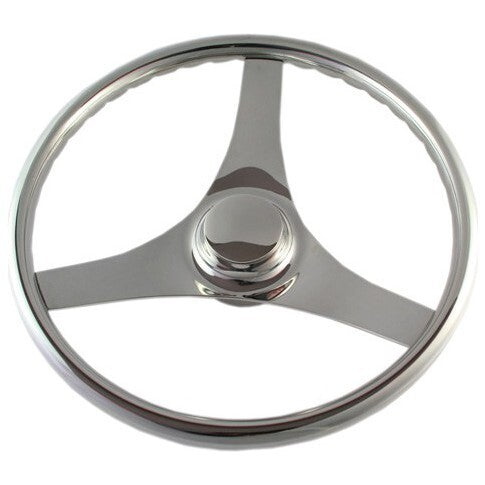 Highly polished 316-grade stainless steel steering wheel featuring finger indents around rim for a comfortable grip.