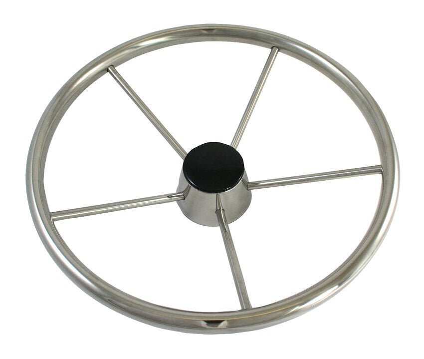 Five spoke boating steering wheel, made from highly polished 316 grade stainless steel with black center cap.