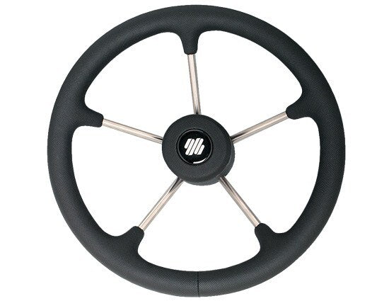 Five spoke stainless steel steering wheel with polyurethane grip. Symmetrical design is ideal for hydraulic steering applications. Non-magnetic stainless steel wheel eliminates compass interference. Fits a standard 3/4? tapered shaft. Supplied with a centre hub & black cap.