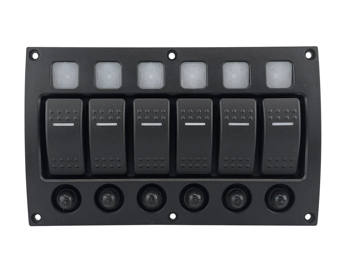 Water resistant curved switch panels with illuminated contura syle rocker switches and manual reset circuit breakers.