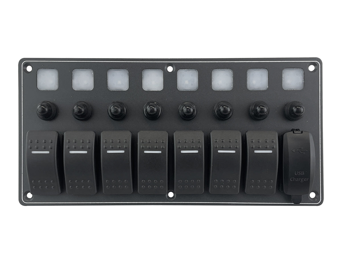 Water resistant aluminium switch panels with illuminated contura syle rocker switches and manual reset circuit breakers.