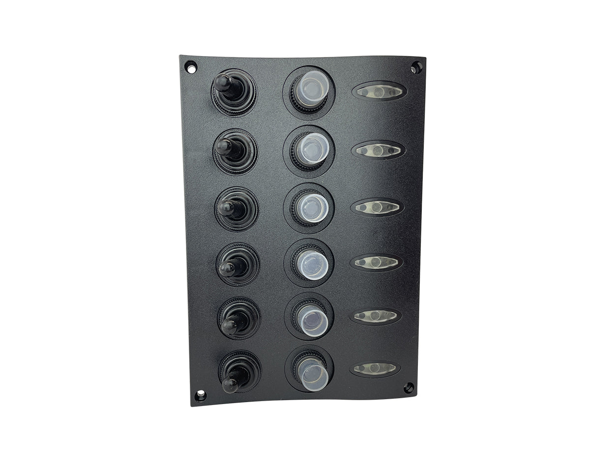 Sealed waterproof switch panel with LED illuminated lights and manual reset circuit breakers. Ideal for marine applications or caravan.