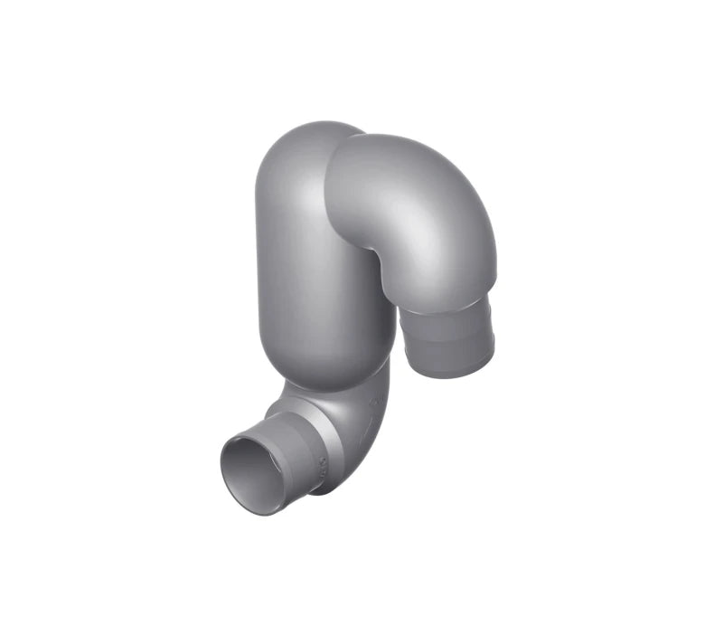 Plastic gooseneck for marine exhaust systems with water injection. Supplied with stainless steel (AISI 316) mounting brackets.