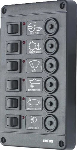 Panel with 6 on/off switches, 6 monitoring LEDs, 6 fuses of 10A. Supplied pre-wired. Made of synthetic, non-corrosive materials. Incl. 60 name plates.