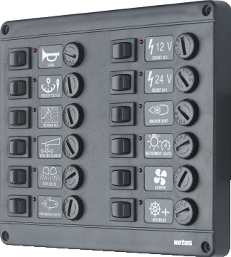 Panel with 12 on/off switches, 12 monitoring LEDs, 12 fuses of 10 A. Supplied pre-wired. Made of synthetic, non-corrosive materials. Incl. 60 name plates.